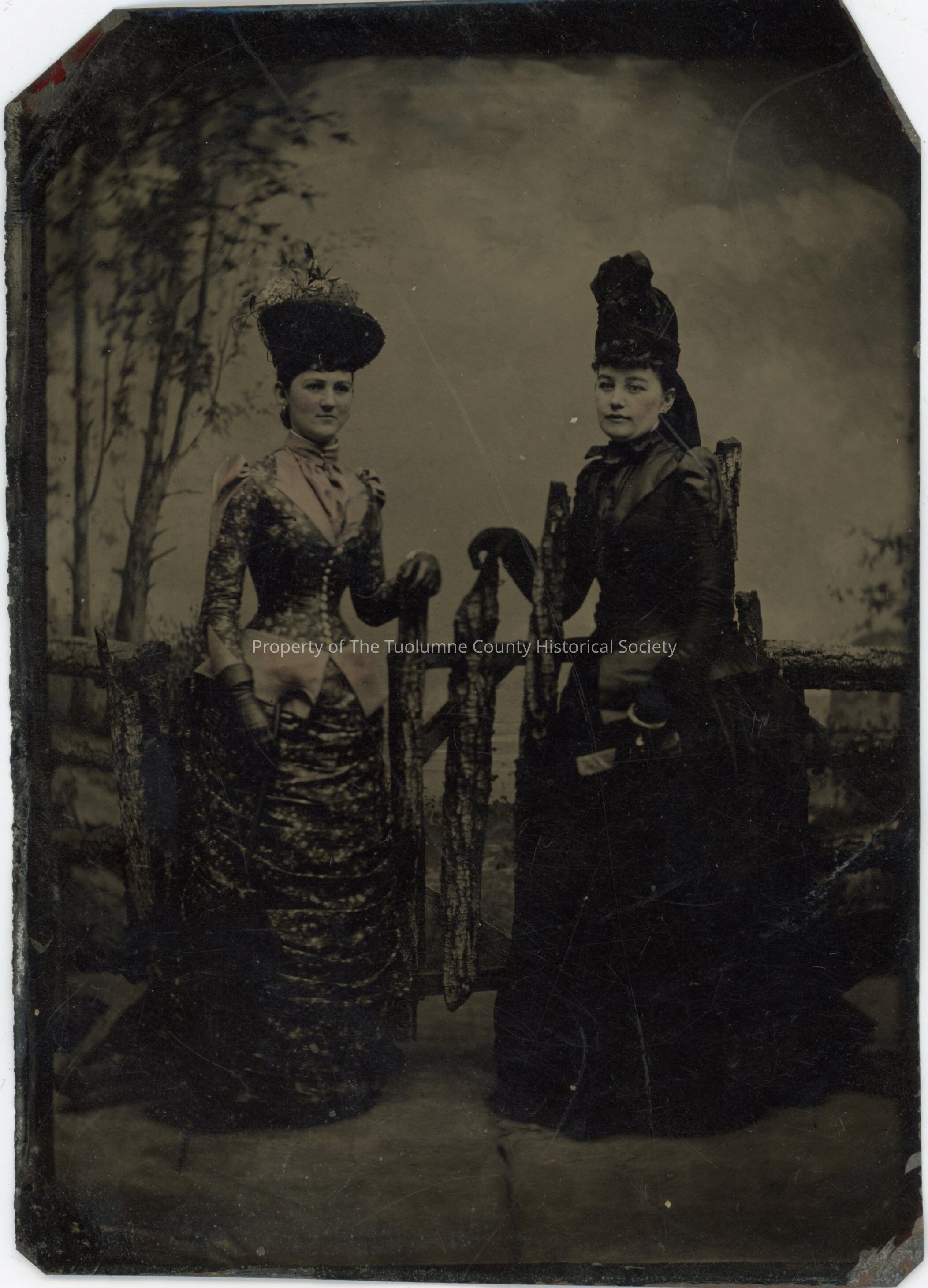 Photograph of 2 unknown women dressed in formal costume in front of a staged backdrop. Colored cheeks.