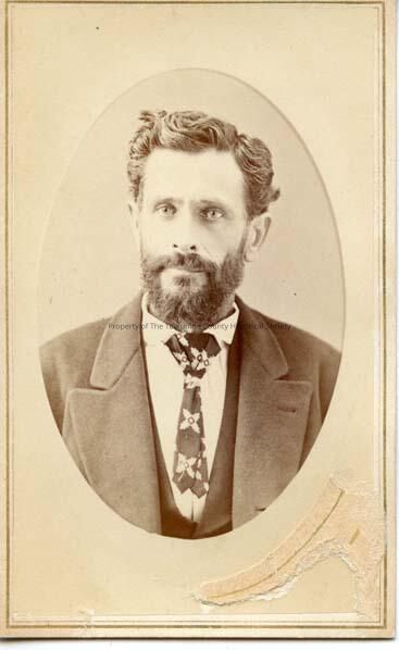 A black and white portrait of an unidentified man with short hair, side part, full beard and mustache.