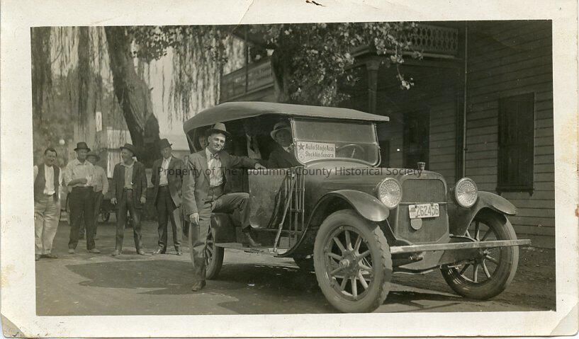 A 3-1/2" x 5-1/2" Black and white photo of an unidentified man standing beside and old auto. Sign on windshield "Auto Stage Area, Stockton, Sonora". Auto parked in front a hotel in Jamestown.Collection