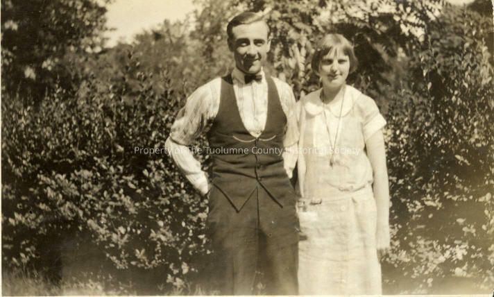 Group: Unidentified man and girl in garden, he is dressed in vest and trousers, striped dress shirt, bow tie, sleeve garter, watch chain across his vest, hair is parted on the left and combed to the right, he is clean shaven. The girl is wearing a two-piece shift dress, short-sleeved top and matching skirt, white cuff trim on the sleeves, white blouse with round collar, chain around her neck and down the front, her hair is bobbed and she has bangs in what is sometimes called "Prince Valiant" cut.