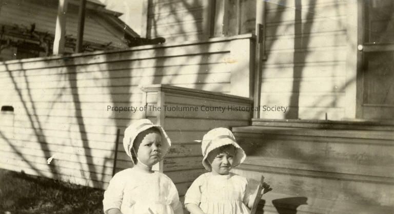 Unidentified children pictured in front of clapboard house, on stairs leading to porch, the children are wearing ribbon-trimmed bonnets, and light-colored short-sleeved dresses, skirts are pleated into lace trimmed yoke.