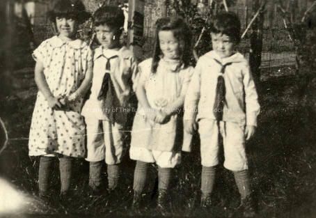Unidentified children, 2 boys and 2 girls, ca 1910-20; the boys are wearing light-colored sailor suits with dark-kerchief ties and knee-length pants, socks or leggings and high-top shoes. The girl on the left is wearing a print dress with peter pan collar, dark socks or leggings, her hair is bobbed above the ears and bangs, the girl on the right is wearing a belted dress over knee- length trousers gathered at the knee and dark stockings or leggings, her hair is parted on the right and drawn to the left to fall in long curls. They are pictured in front of a fence or garden structure.