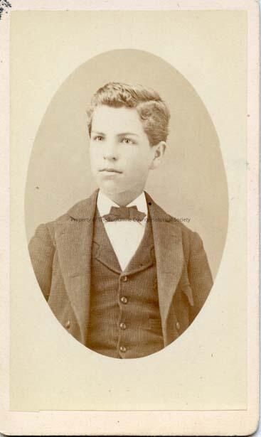 A black and white portrait of an unidentified young boy wearing a three-piece suit and a bow tie; he has short hair with side part.