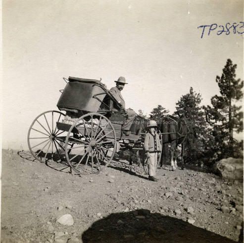A black and white photo of an unidentified man sitting in buggy with boy standing alongside. (Possibly a Fahey Family member at Bell Meadows).