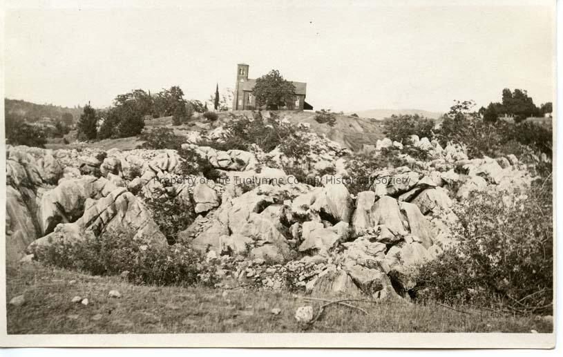 A black and white photo postcard of St. Anne's Catholic Church in Columbia, c.1921. St. Anne's was restored in 1963, sufficiently to hold once a month services.