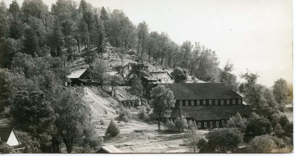 A black and white photo of the buildings at the Crystalline Mine. A tree covered hill behind the mine. Crystalline Mine is a cultural feature (mine) in Tuolumne County located 1.4 miles E.NE. of Jamestown.