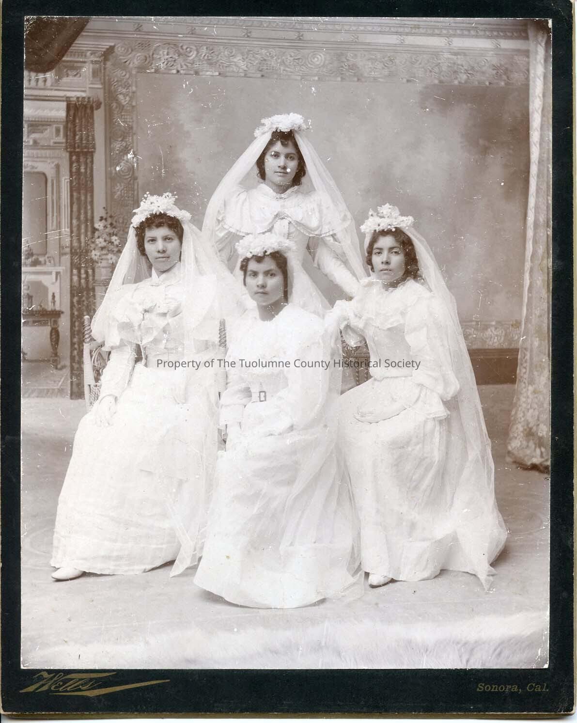 A black and white photo of four (4) unidentified young ladies wearing their 1st Communion dresses.