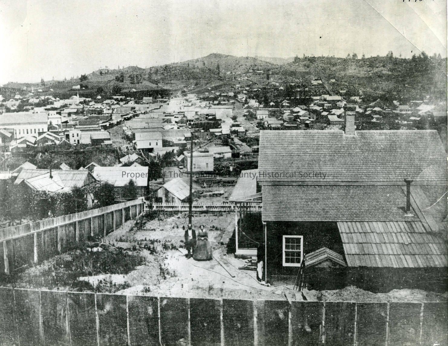 Landscape - Looking north from Maiden Lane across Main Gulch about 1860 Columbia. Unidentified man and woman standing in backyard of a home. Type: Paper