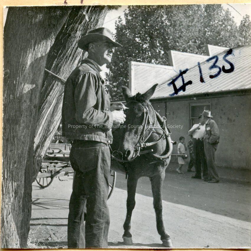 A black and white photo of an unidentified man and his mule standing by a tree in Columbia.