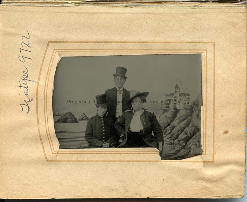 A 3.5" x 2.5" Tintype black and white photo of two unidentified women and one unidentified man posing for against a backdrop with water, rocks and large building.