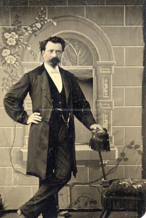 A tintype photo of an unidentified man with dark hair and beard. long suit jacket, watch fob and chain on vest. Album #11 Sewell Collection. Circa 1890-1910.