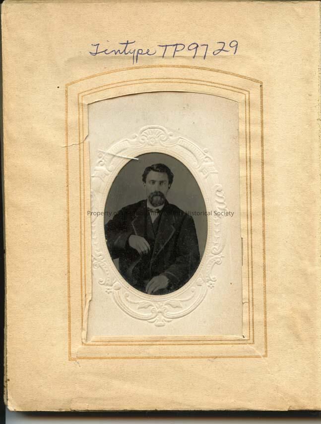 A 2.5" x 3.5" Black and white tintype portrait of an unidentified man.Wearing white shirt with bow tie., has full beard.