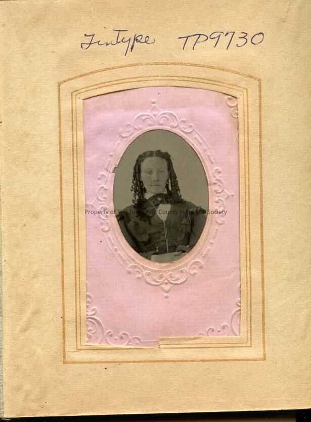 A 3.5" x 2.5" Black and white tintype portrait of an unidentified young lady. Wearing dress with large bow on collar and has long curls.