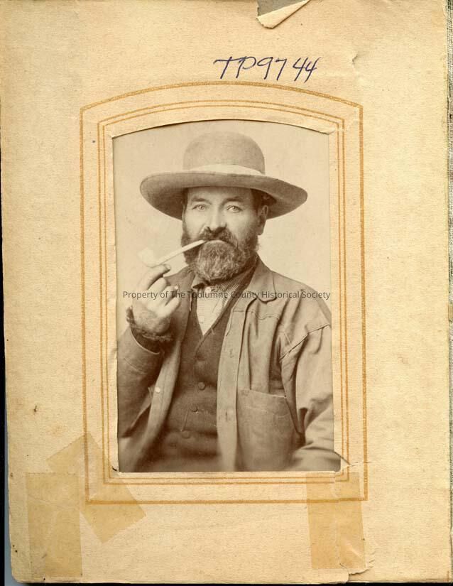 A 3.5" x 2.5" Black and white portrait of an unidentified man wearing a large hat and smoking a pipe.