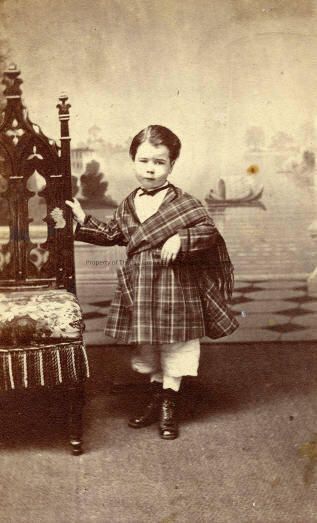 Portrait- Unidentified Little boy in kilt. He is standing next to a very ornate high- backed chair. His is wearing pantaloons under the plaid kilt and high top shoes. .
