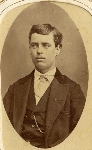 A Black and white portrait of an unidentified man with dark hair,side part, suit with watch chain on vest. Album #11 Sewell Collection. Circa 1890-1910.
