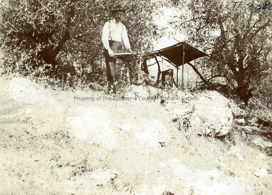 Landscape-Mine shaft entry. Unidentified man with pick. Located on a hillside. Oak trees in the background. A canopy is over the mine entrance.