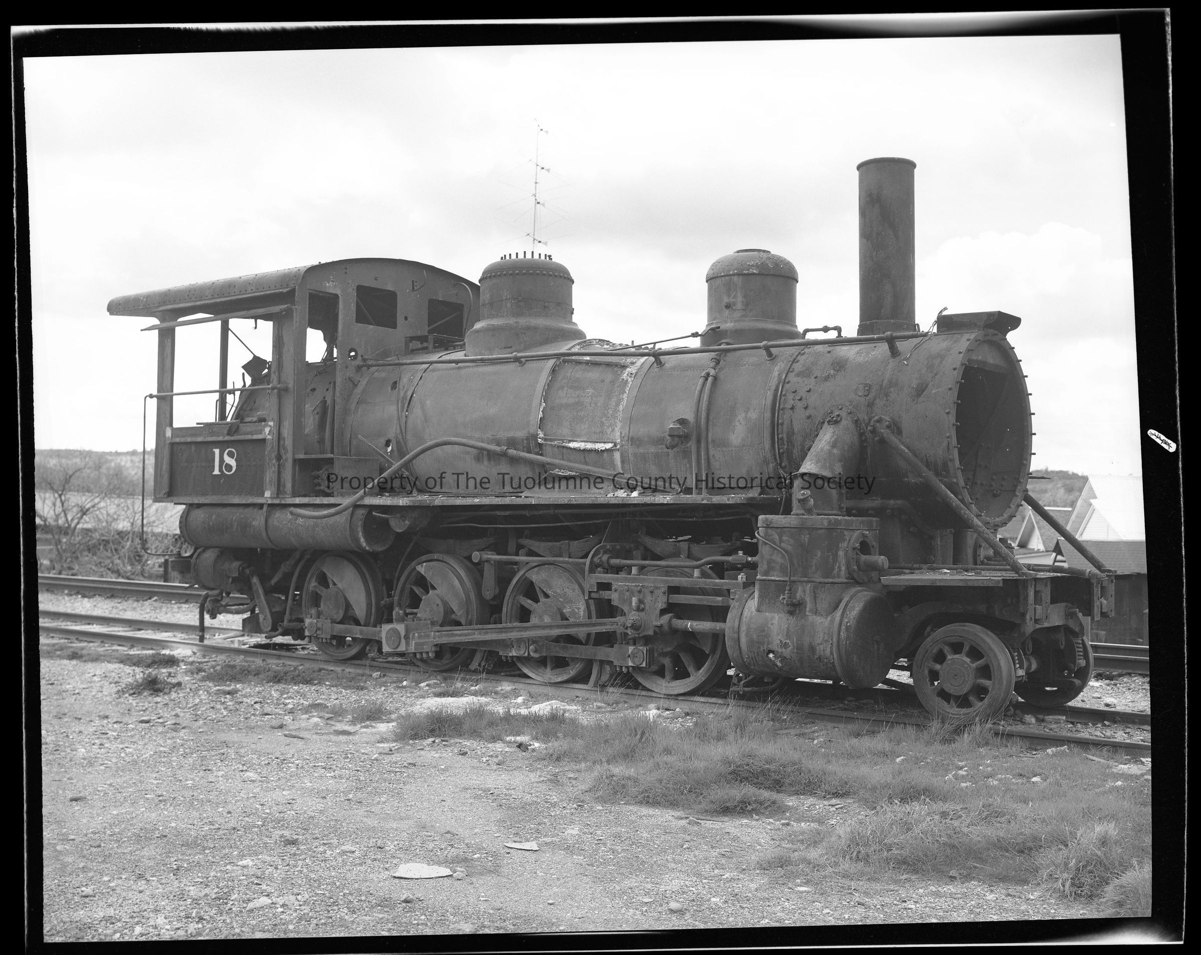 I found nine negatives. Each should have its own file, which I am now doing. This negative shows Sierra Rail Road engine #18 on a siding stripped of all the parts someone thought could be useful at some time in the future. This is a right side view of the engine. The demolition had even entailed some rermoval of sheetmetal and insulation from the boiler. Not a lot but some.