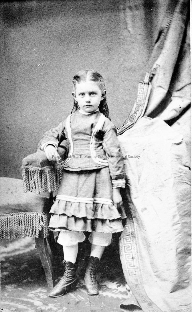 A portrait of a young girl. She is standing next to a chair with her right arm on the top of the chair. She is wearing boots, white stockings, white bloomers, a skirt with two riffles at the bottom and a white ribbon above the ruffles. Her blouse has a ribbon that is going from one side of the front up around her shoulders and back down the front on the other side, long sleeves with lace cuffs. Her hair is long and pulled back and parted in the middle. There's a drape hanging on her right.Collection