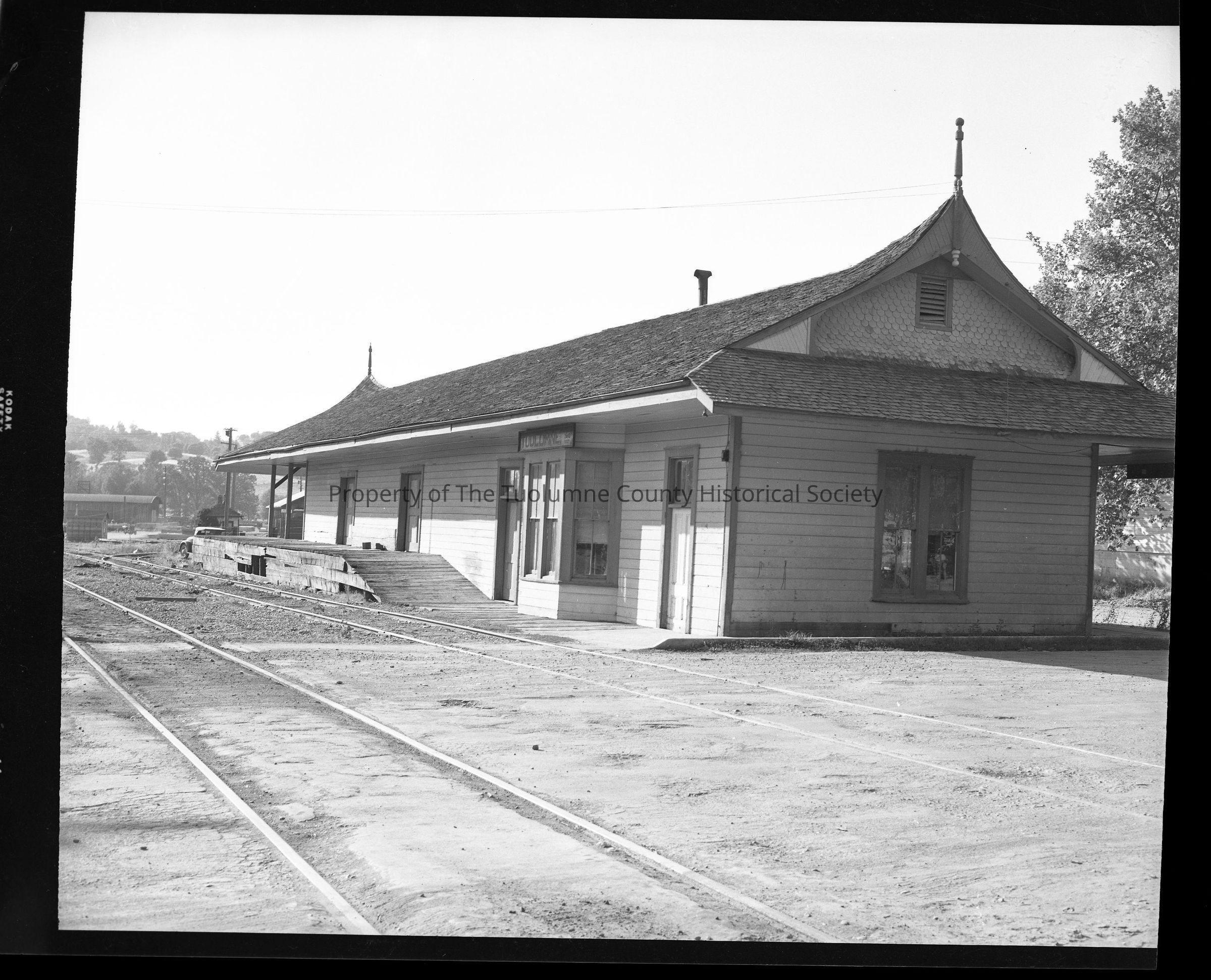 Black and white photo of the Tuolumne City Depot. This photo shows the passenger or office end of the station. There are three windows in the side of the building facing us. There is a door on both sides of the windows. There is a sign above the three windows proclaiming this location to be Tuolumne, elevation 2563 feet. The sign is quite dirty and hard to read entirely. A floodlight has been installed at the corner up in the eave. The bare wire runs down the corner to a large old style hand throw switch box. (6"wx10"hx4"d). From there the wire runs down the corner and into the concrete walk I think. In TP18085 the bare wire has been installed into conduit from the ground up to the switch box. Above there is still bare wire. One step at a time I guess. At the base of the second door a ramp starts ascending up a few feet to an elevation suitable for loading and unloading railroad cars. There are two man sized doors along the platform. The platform looks to be 50 or 60 feet long and is rather roughly constructed. I can't see the far end of the station but there does appear to be an area where larger sized parcels and/or heavier loads can be handled. There is a definite roofed area without walls that would suggest that maybe there are large warehouse doors. A concrete wall about four feet high behind the railroad station indicates that the next street is four or five feet higher than the railroad station. A gated fence atop that wall keeps stray cars, cats, dogs and children off the railroad property.