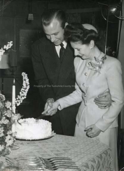 A black and white photo of an unidentified couple (man and woman) cutting wedding cake. Photo from the Union Democrat files.