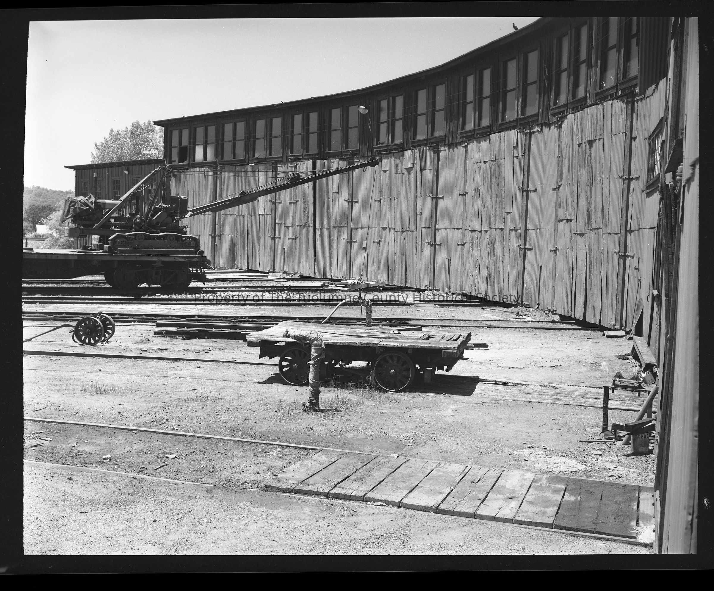 This photo shows the back side of the roundhouse, where all the doors are for receiving the engines. In this photo all the doors are closed. In the foreground, second track over, is a small unpowered handcart, consisting of four wheels and some planks on a metal frame to give it strength. It is used to move items around the yard. Several tracks over, an ancient track laying gas or diesel powered, hoist is mounted on a flat car in what appears to be semi permanent fashion.