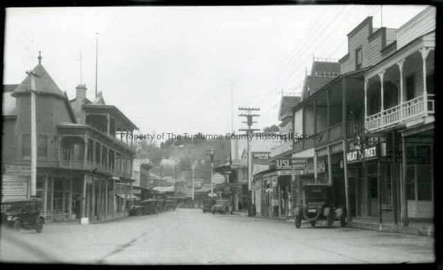 Sonora; downtown looking North at Stockton Street up Washington St. from the Hotel Victoria. Shows both sides of street. C1920s