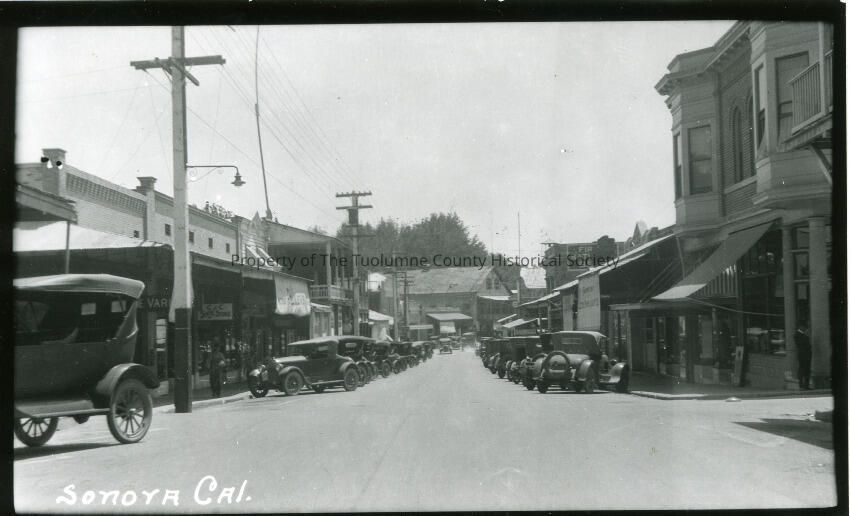 Sonora, downtown; looking South down Washington St, from Bradford Avenue. City Hotel at end of street. Shows both sides of street. c1920s