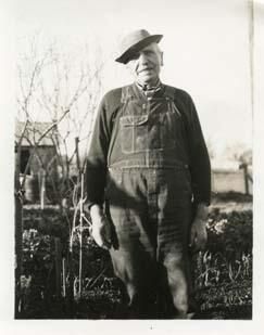 A black and white photo of an unidentified man wearing overalls and hat standing garden. Location unknown. Photo from the Union Democrat Type: Paper