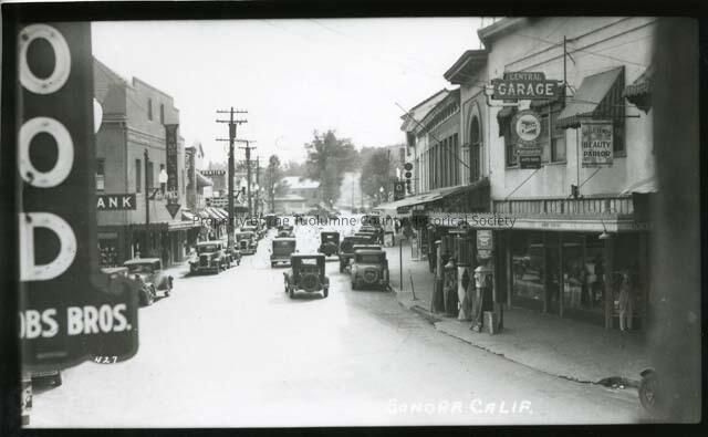 Sonora, downtown; looking South on Washington St.; Central Garage on the east side with City Hotel on the west (left), food sign is for Jacobs Bros. c 1920/1930s