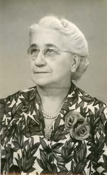 A black and white portrait of an unidentified lady. Wearing floral print dress, pearl necklace, glasses. Photo from the Union Democrat files.