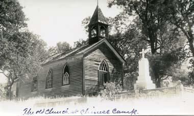St. Francis XavierCatholic Church, Chinese Camp, CA. Graveyard in the front. Type: Paper