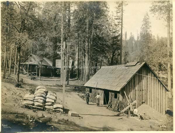 Two cabins and work shop at Middle Camp Road area. Stacks of bags on two pallets. Two unidentified men in front of work shop., Sugar Pine/Middle Camp, Econ/Indus, Logging/Lumber