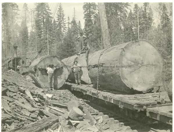 Huge logs being loaded at Middle Camp, onto 24' flat cars. Men not identified. Late teens-1930