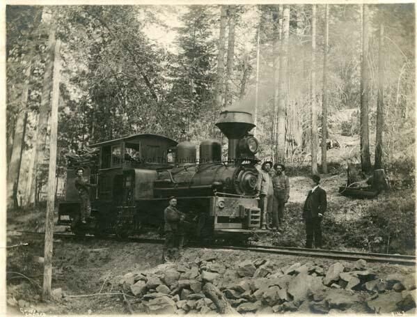 Locomotive- Sugar Pine Railroad. Middle Camp Road, men not identified. Type: Paper