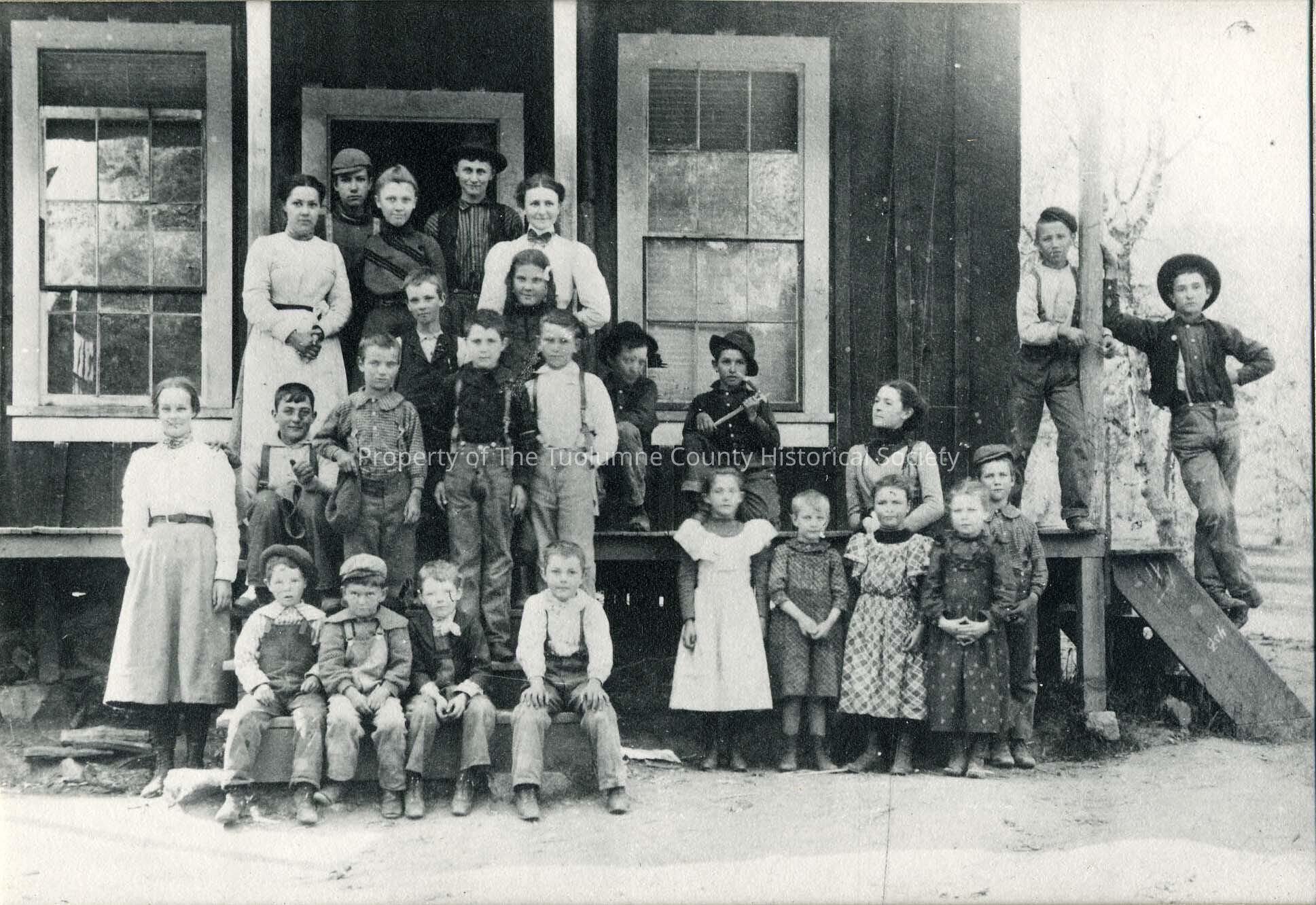 School-Arastraville; 1. Foster Anderson, 2.C. Scanivino, 3.Charles Morrison, 4. Myrtle Haley, 5.Dan Mulock, 6. N. Tyler, 7. Clarence C. Mulock, 8. Laura Mullers, 9. Roy Cullers, 10.Alice Wilson Myer, 11. Willie Gianelli, 12.Della Gianelli, 13. May Wilson Austin, 14.Chas Haley, 15.Henery Scanivino, 16.--, 17 H. Tyes, 18. Chauncy Mulock, 19. Dell Sivori, 20. Mary Yyes, 21. Teacher-Myrtle Knowles, Grace Blake