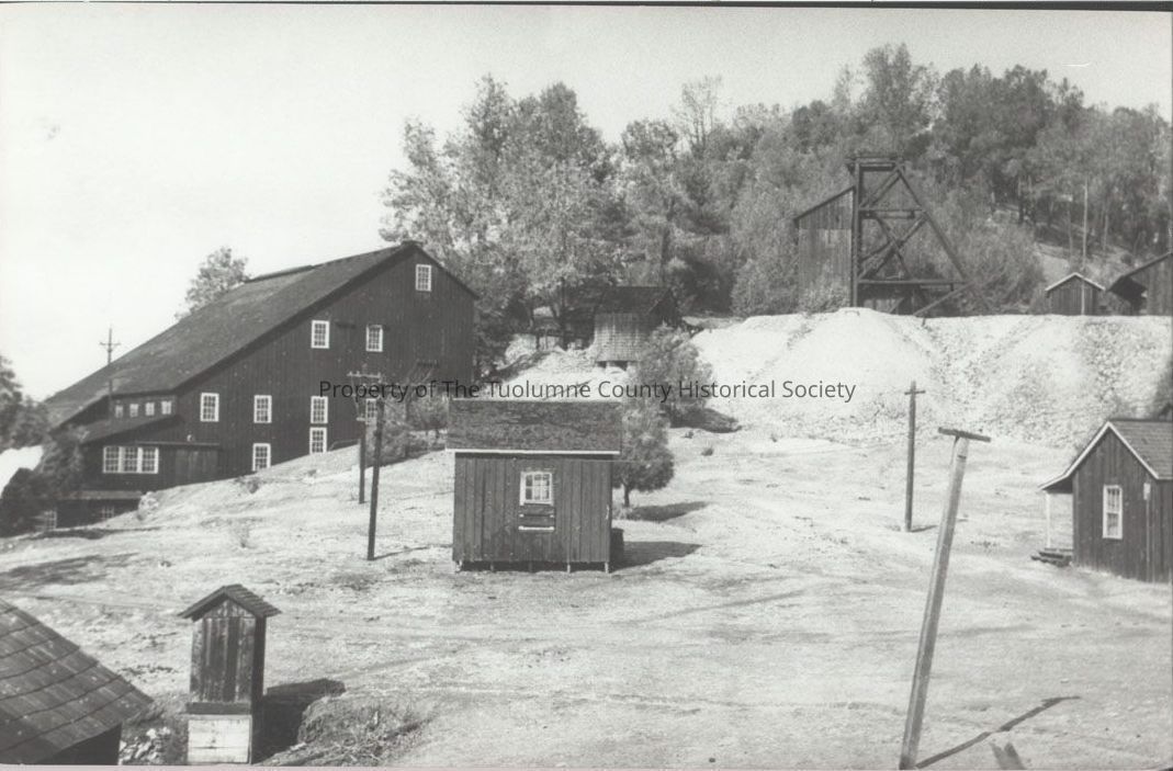 Black and white landscape photo of the Santa Ysabel mine. Photo shows several buildings and in on mounting board. The Santa Ysabel; Mine is located 2.4 miles north of Jamestown.Collection