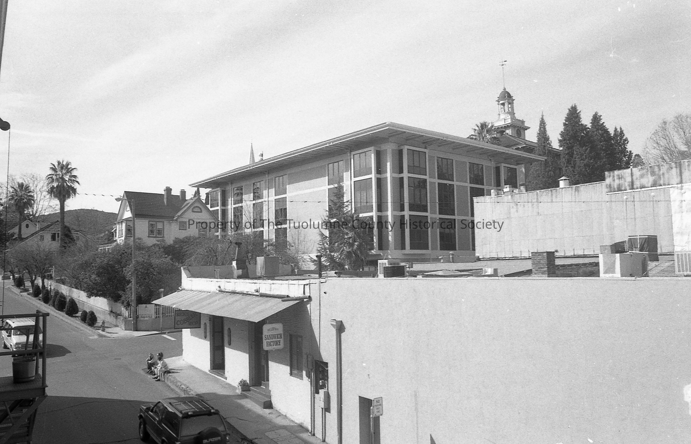 Bradford St. from Washington St. looking west. Ricks' Cobbler and the Tuolumne County Administration building. 2 photos. 1994Collection