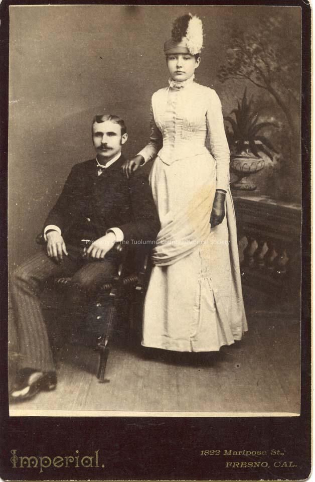 Fashion, Photography, 1900 - 1915, Clothing, women's, Dress with cummerbund, Hair parted on side/mustache, hair style pulled back with curls, Hair style, women's, hat with feathers, long white dress, Man In Dark Color Suit With Bow Tie, Biography, unidentified couple