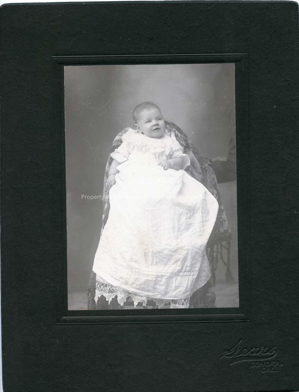A 9" x 7" Black and white portrait of an unidentified baby wearing long dress sitting in chair covered with fringed cloth.