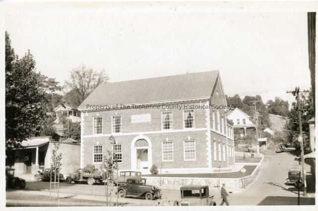 Veterans Memorial Hall, N. Washington St., Sonora, at Jackson Street. Can see new trees at Courthouse Park. c mid 1930s.