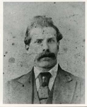 A black and white photo of an unidentified man. Short hair, mustache, suit and tie with pin. Type: Paper