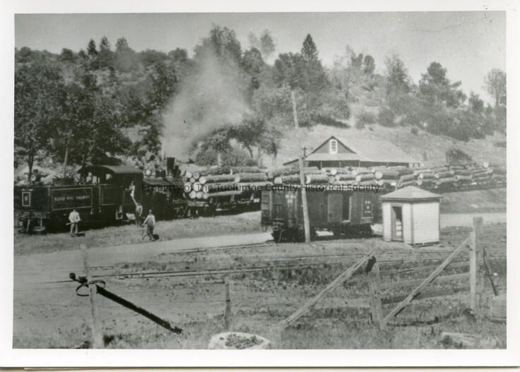 Sugar Pine Railway - Heisler engine # 5 at Ralph Station near Tuolumne in 1916. Hauling a number of flat cars loaded with logs going to the mill. Station house is in the background. in the foreground is a fence and gate, a small shack and box rail car.