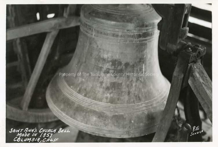 A black and white photo of St. Anne's Catholic Church bell. Made in 1857, in Columbia, CA.