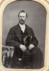 A black and white portrait of an unidentified man. Wearing a 3 piece suit, beard, mustache. Sitting with arm resting on a cloth covered table and holding a cane. A 2 cent stamp on back of portrait. Photo from the Helen E. Francis album.