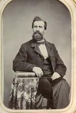 A black and white portrait of an unidentified man with full beard and mustache. Sitting on chair with arm resting on a cloth covered table. A 2-cent stamp is affixed on back. Photo from the Helen E. Francis album.
