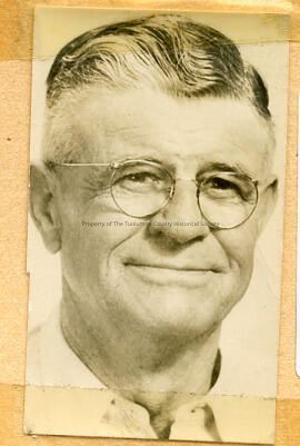 A Black and white portrait of an unidentified man, short wavy hair, side part, wearing glasses. Album #17 Type: Paper