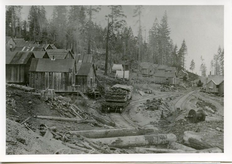 Camp Roth - Standard Lumber Company. Showing the workers and family cabins and tents with a rail car that has lumber on it and a motor rail car in the distance on the track. Manny Marshall Collection part of the June Madrid Collection.Collection