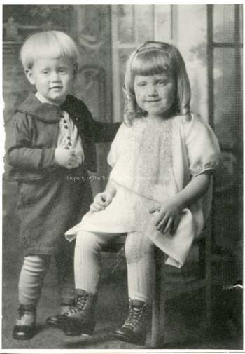 A black and white copy of a portrait of an unidentified young boy and girl. Both have light color hair, girl with long curls. Young girl is sitting on a chair and boy standing beside her.