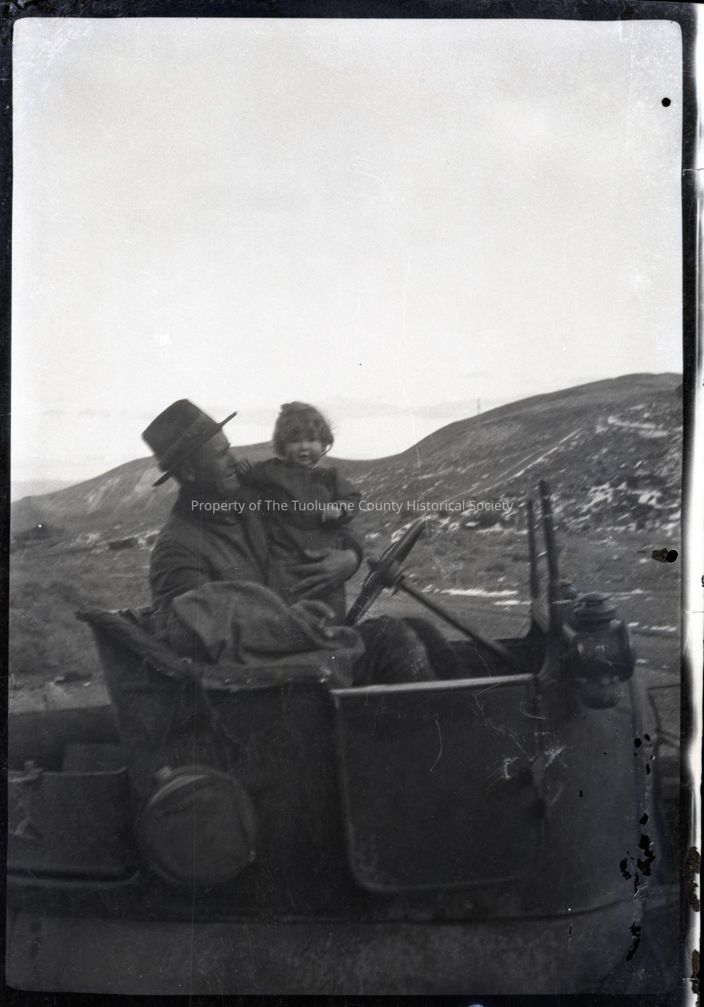 Black and white photo negative of an unidentified man and a small child in old-time Ford Pickup.